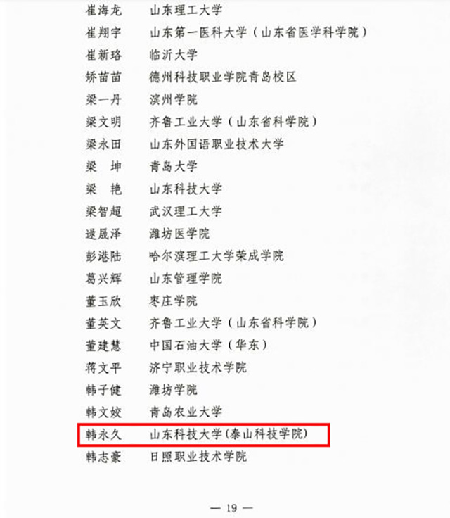 近日,由共青团山东省委、山东省学生联合会、山东省青年志愿者协会联合开展的山东省大学生“青春贡献奖”评选结果揭晓,对省内外414名大学生给予通报表扬,我校智能工程学院机械设计制造及其自动化19-2团支部书记韩永久同学获得“山东省大学生‘青春贡献奖’”荣誉称号